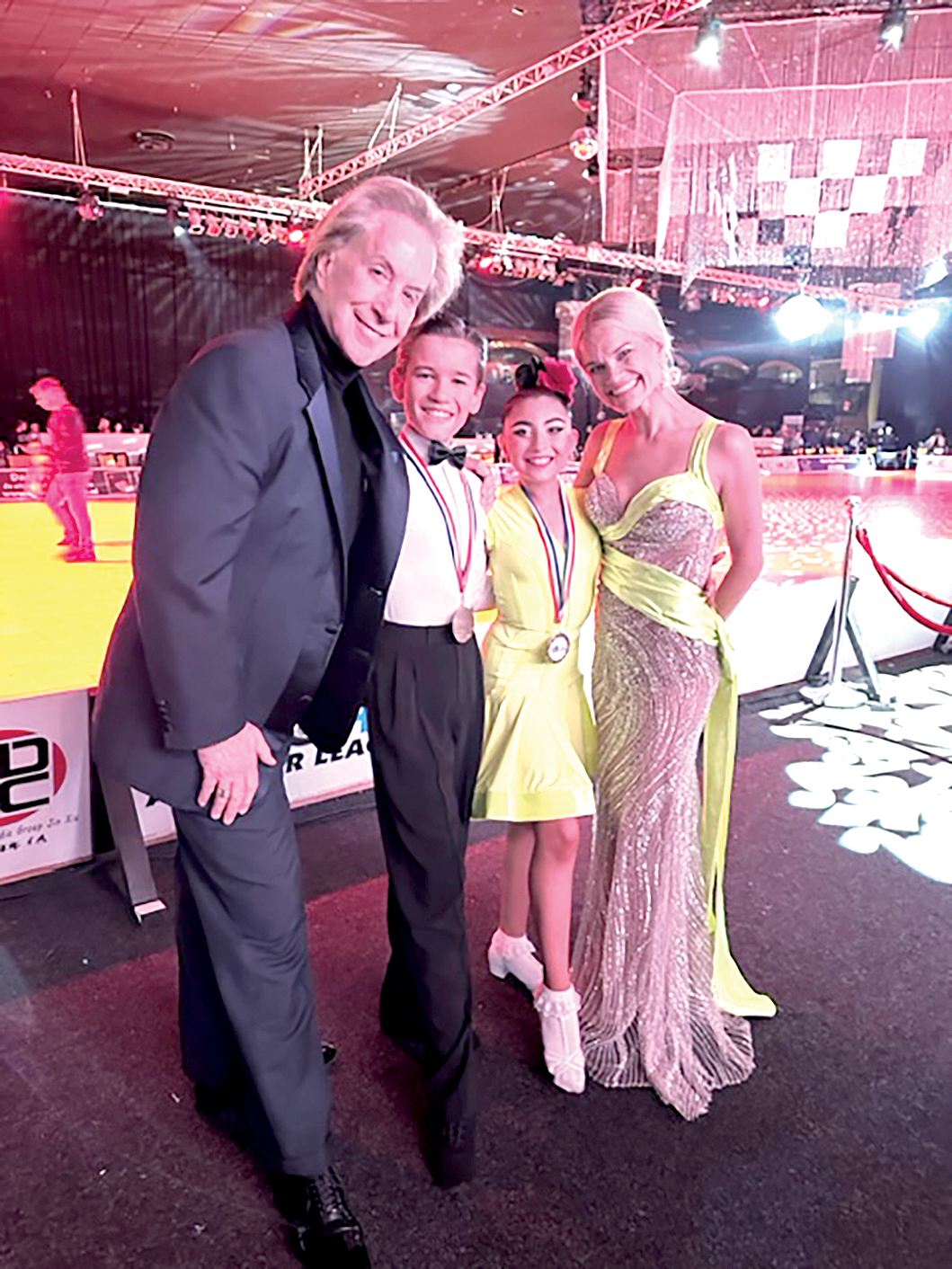 Juliana Gekker and Domenico Burns, with Domenico’s parents Donnie Burns, left, and Heidi Burns, right, after winning the World Dance Championship in the Netherlands in November. Courtesy Heidi Burns
