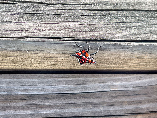 The spotted lantern fly (SLF), a colorful invasive insect, arrived in Pennsylvania in 2014 and was seemingly unstoppable due to a lack of natural predators and an uncanny ability to hitch rides with unsuspecting drivers. Besides damaging plants (especially the Tree of Heaven and vine- yards), they are a nuisance, hopping onto backyard trees, furniture and surprised folks. SLFs secrete a “honeydew” coating on plants which attracts sooty mold and disrupts photosynthesis, yet it turns out bees use this honeydew as food to convert to hive honey. New Jersey’s Stomp It Out campaign calls for squishing all black nymphs and red- and black-winged adults, using tree traps for larger infestations, and scraping and destroying egg masses that overwinter on tree trunks or outdoor furniture and equipment. Fortunately, SLF populations have started to decline, partly due to this squishing effort, a fungal disease, and the development of natural enemies such as birds and predatory insects, who learned these SLFs are edible despite a bitter taste.