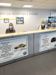 Customers at Circle BMW are greeted by employees Jillian Clancy, left, and Makayla Soto, wearing face masks and seated behind plexiglass shields, just a few of the new safety precautions being taken by the dealership as show- rooms reopen.