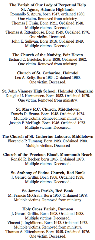 This list of churches and schools where the 30 men served ran the gamut, from those in Red Bank to Rumson to Holmdel, among other places. Representatives of area churches directed questions to the diocese or did not return phone calls seeking comment.