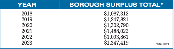 In reviewing the borough’s surplus numbers across previous years, there are no discrepancies that indicate surplus set aside for 2023 disappeared. In fact, in 2023, the borough’s surplus funds were the second highest since 2018. In 2022 the account held $1,093,861, while in 2023 it grew to $1,347,319 – about $260,000 higher than its 2018 figure.