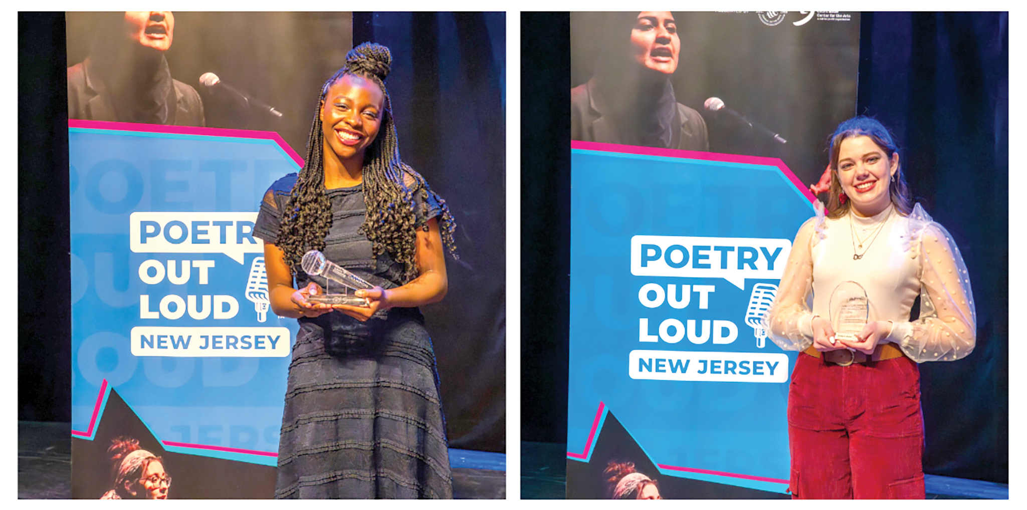 Joy Ogunsakin, left, a senior at Trinity Hall, was named champion at the 2026 New Jersey Poetry Out Loud State Finals at Count Basie Center for the Arts in Red Bank. Evelynn Knox, a sophomore at Henry Hudson Regional School in Highlands, was named state runner-up. NJ STATE COUNCIL ON THE ARTS