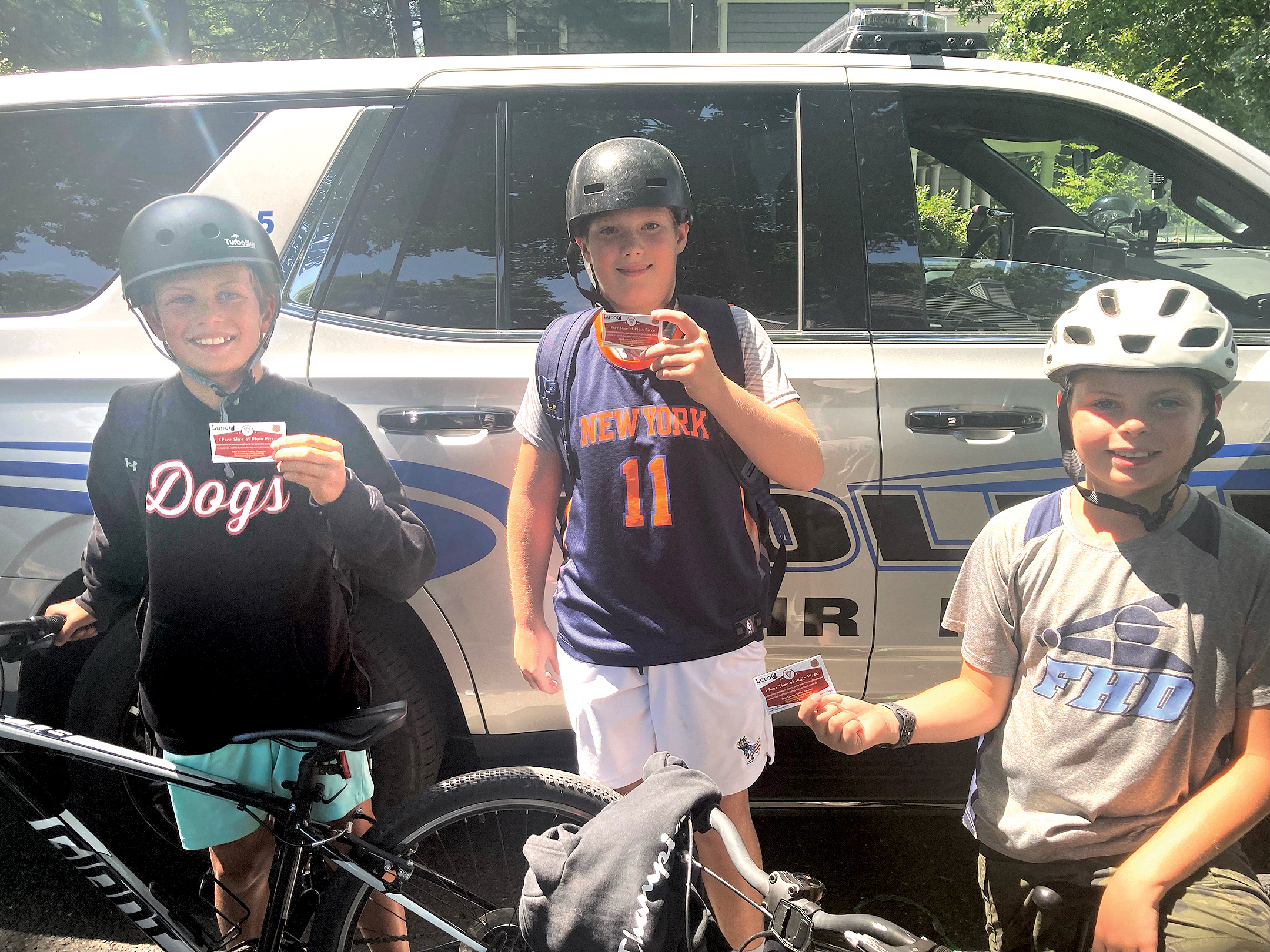 This year, in partnership with Lupo Pizzeria, the Fair Haven Policemen’s Benevolent Association (PBA) summer safety campaign is rewarding children who wear bicycle helmets with vouchers for a free slice of pizza when they see them around town. So far, it’s a hit.