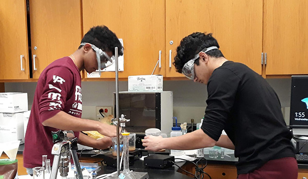HOLMDEL – Sourish Jasti, left, a senior at Holmdel High School, was selected as one of the winners in the annual Jersey Shore Junior Science Symposium at Ocean County College. He presented research on the use of coffee and tea as low-cost water filtration options for rural populations. Research was conducted in the Honors Advanced Research class taught by Josephine Blaha at Holmdel High School.