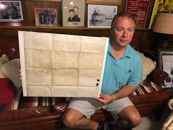 Monmouth County Historical Commissioner Peter VanNortwick displays an original 1701 property deed from Richard Clark of Freehold to John Bowne of Middletown.