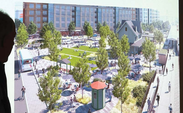 An “Oakland Street Promenade” will connect the central Station Square area to the surrounding Oakland Street, offering a “curbless environment,” Goodill said, with priority to pedestrians and cyclists. Traffic calming measures will restrict cars to 5 MPH on the “serpentine” street with a “little bit of rumble” that will temper the speed. The street can also be closed for community events such as farmers markets, art fairs or car shows.