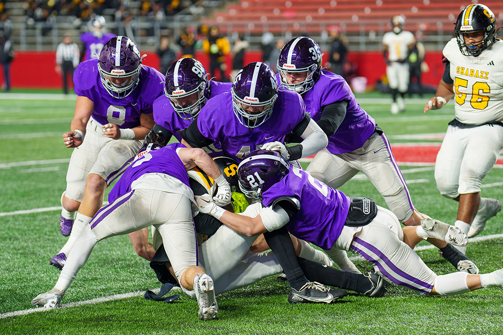 After Shabazz used its final timeout in the first half, it appeared Rumson-Fair Haven was going to punt the ball away on fourth down, trailing 16-13 with 1:29 left in the second quarter. In a brilliant move, RFH brought out its punt team only to have it sprint off the field so O’Toole and the offense could return. The RFH quarterback threw over the middle to tight end Jack Gyimesi to the 17-yard line on the fourth-and-5 conversion. Two plays later, Murray got to the edge and turned upfield, flipping over a defender for a 17-yard touchdown run, giving the Bulldogs a 20-16 lead into halftime.